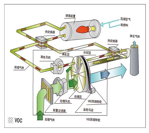 含有低浓度VOCs的废����� �������Ƴ������������ �������Ƴ����������� �������Ƴ������������ �������Ƴ�������气通过蜂窝状沸石时,VO����� �������Ƴ����������� �������Ƴ������������ �������Ƴ������������ �������Ƴ�������Cs成分被吸附在沸石中,净化后的气����� �������Ƴ������������ �������Ƴ������������ �������Ƴ������������ �������Ƴ������体排放到大气中,或排放至室内进行循环处理,通过循����� �������Ƴ������������ �������Ƴ������������ �������Ƴ������������ �������Ƴ�������环����� �������Ƴ������������ �������Ƴ������������ �������Ƴ����������� �������Ƴ������������ �������Ƴ�������处理,回收热能。此时,已吸附VOCs的蜂窝沸����� �������Ƴ������������ �������Ƴ������������ �������Ƴ����������� �������Ƴ������石连续旋转,利用少量的加热空气在解吸附模块进行����� �������Ƴ������������ �������Ƴ����������� �������Ƴ������������ �������Ƴ�������解吸附再生,在此过程中,能够����� �������Ƴ������������ �������Ƴ����������� �������Ƴ������������ �������Ƴ�������从低浓度的废气中得到高浓缩气体。